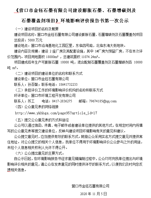 《營口市金鈺石墨有限公司建設(shè)膨脹石墨、石墨增碳劑及 石墨覆蓋劑項(xiàng)目》環(huán)境影響評價報(bào)告書第一次公示